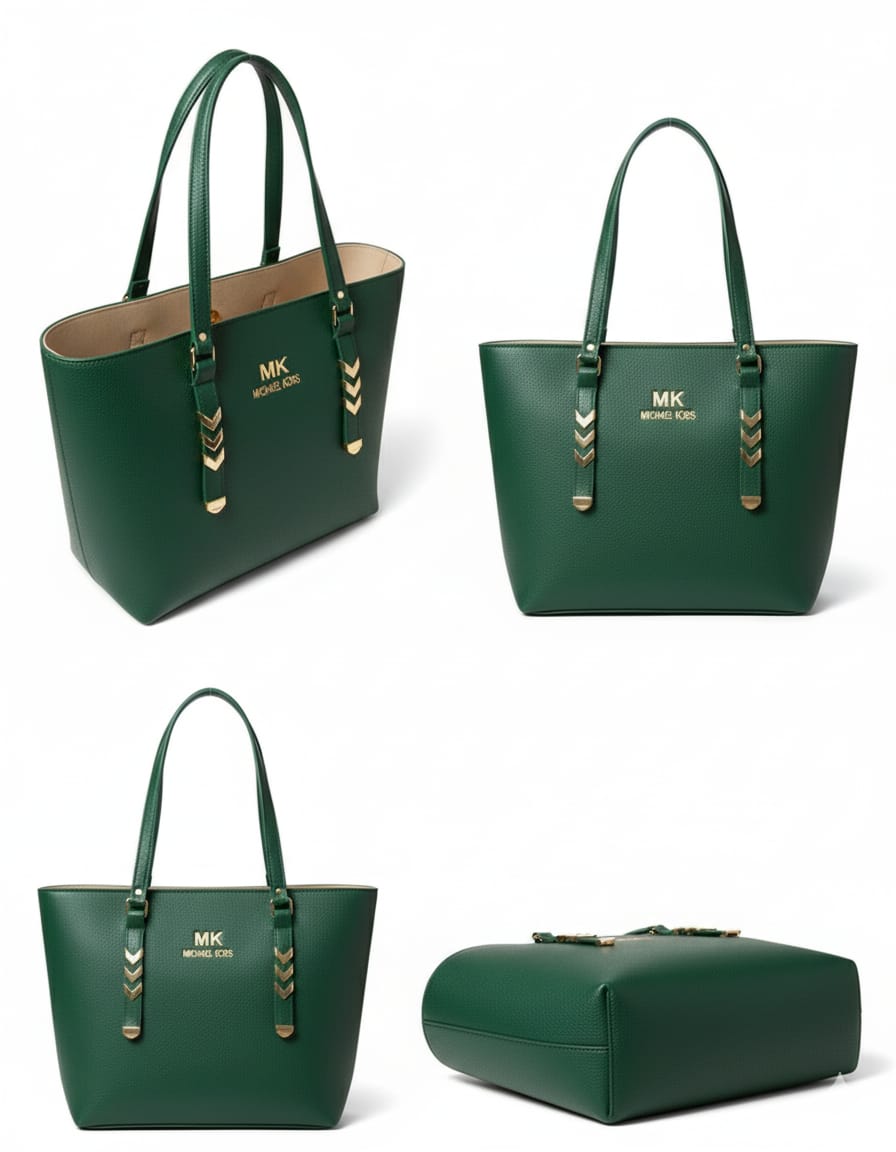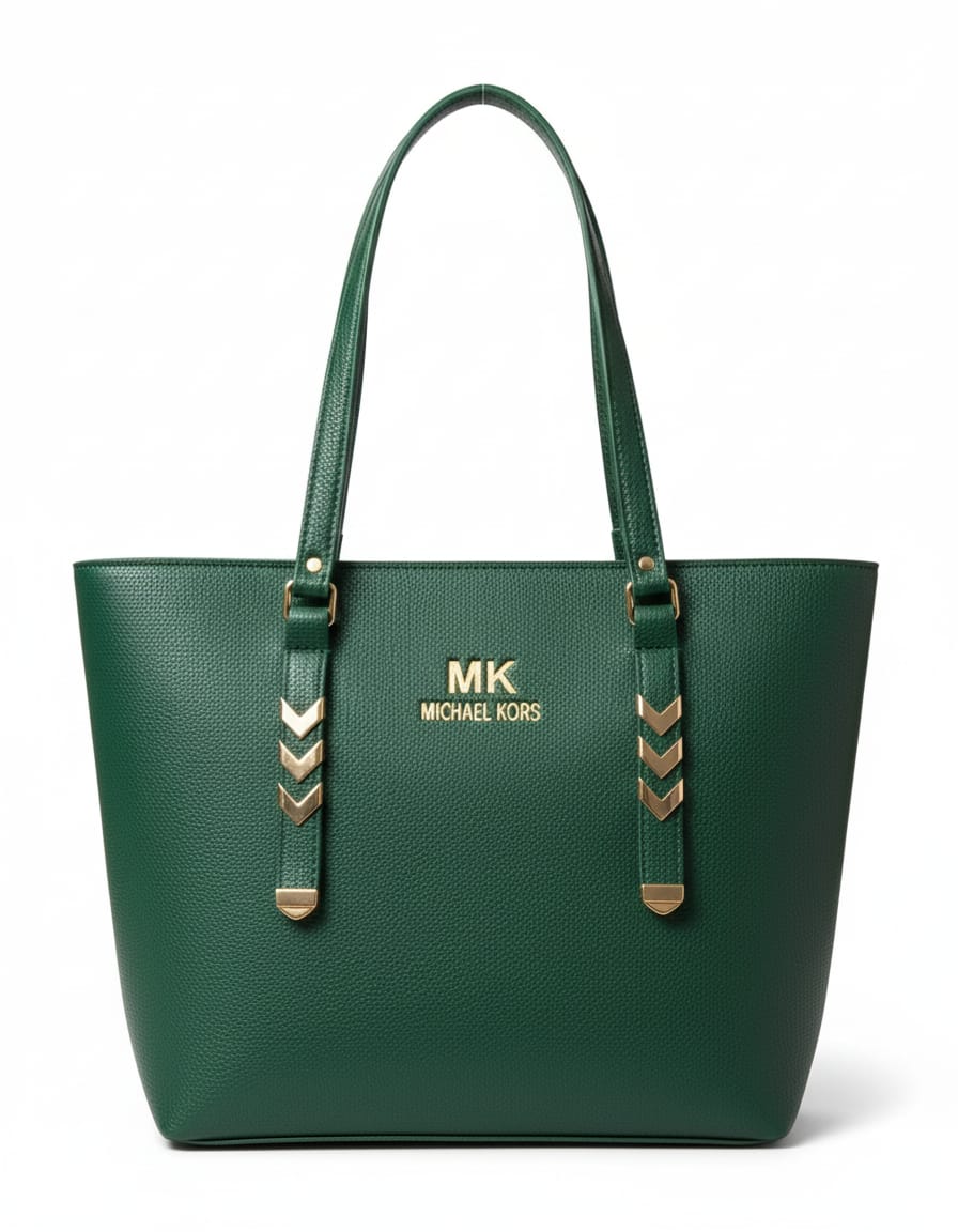 The bag features a classic, structured silhouette with a spacious interior, making it the ideal everyday carryall for your work essentials, tablet, or daily necessities. The vibrant green color is perfectly contrasted by elegant gold-tone hardware, including the prominent ‘MK Michael Kors’ logo on the front and unique chevron-arrow metal detailing adorning the top of the shoulder straps.