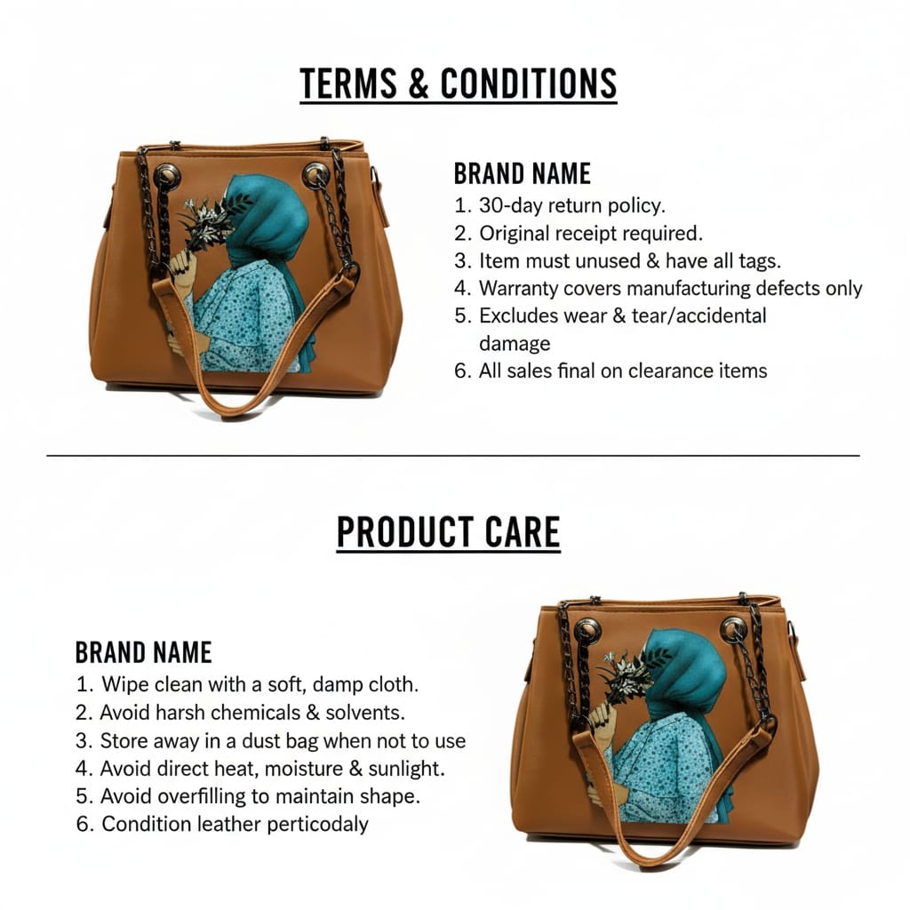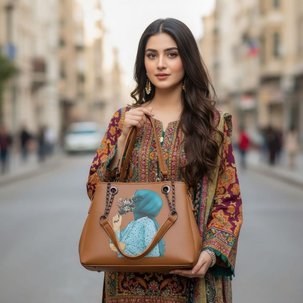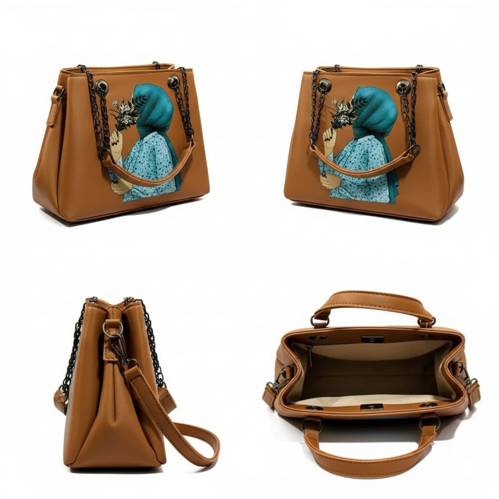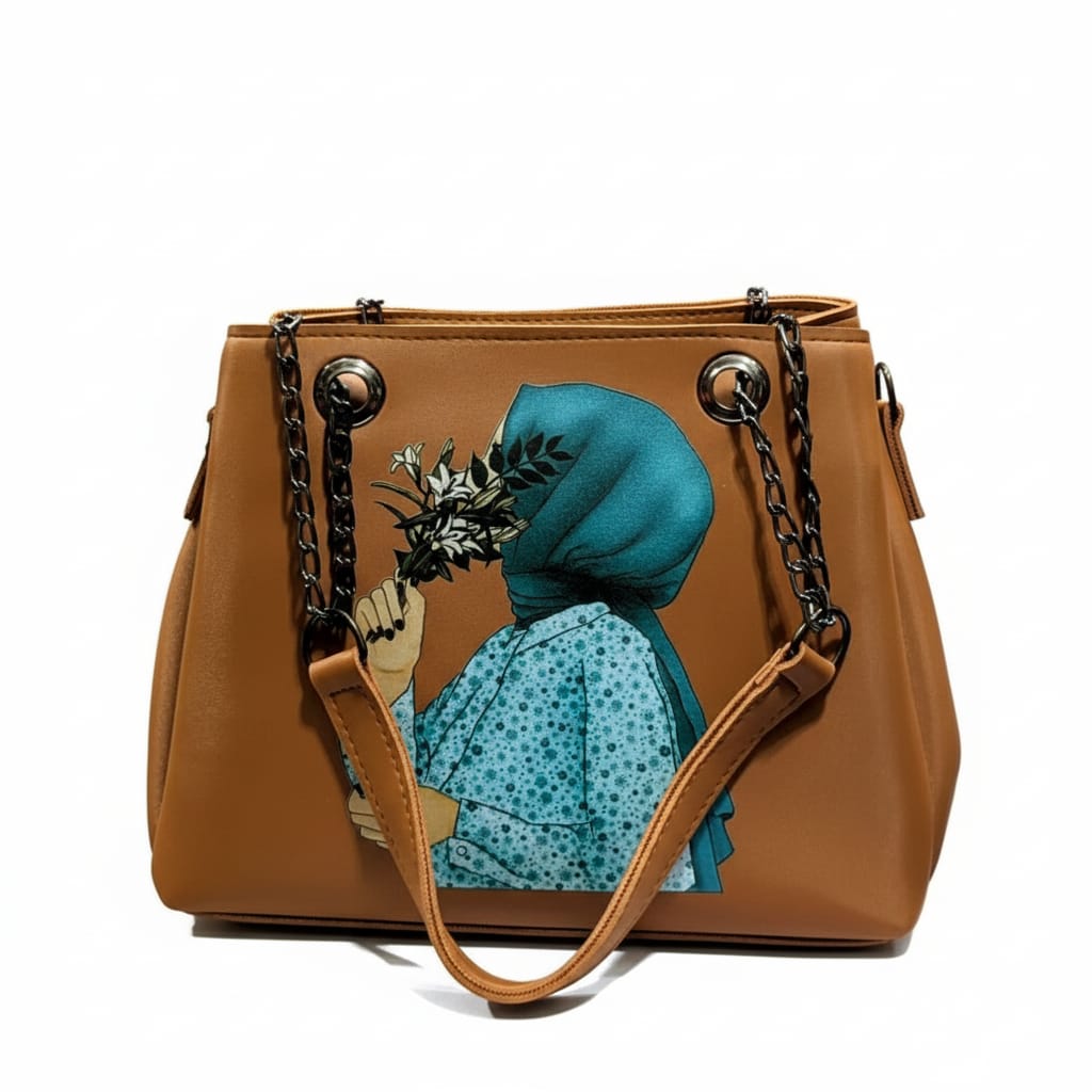 This isn’t just a bag; it’s a wearable piece of art. Crafted from a rich, cognac-brown vegan leather, this stylish women’s handbag features an eye-catching illustration of a woman in a beautiful teal and patterned hijab holding white lilies. This distinctive graphic gives the tote a sophisticated, artistic flair that sets it apart from the crowd.