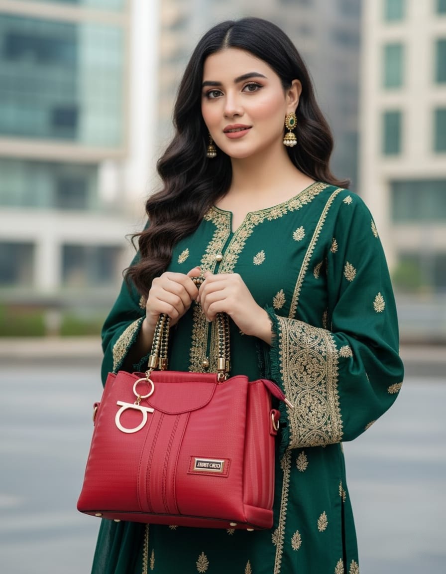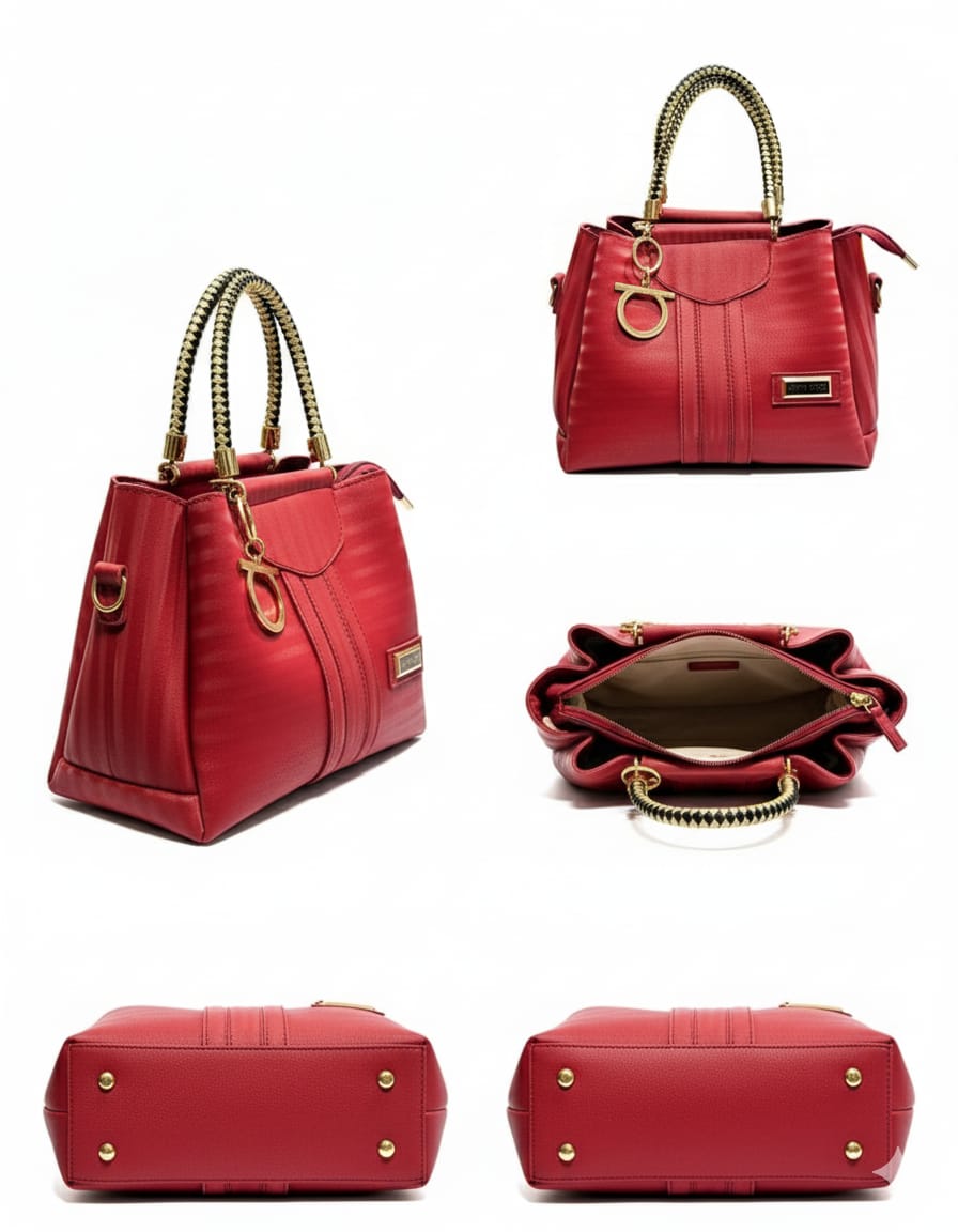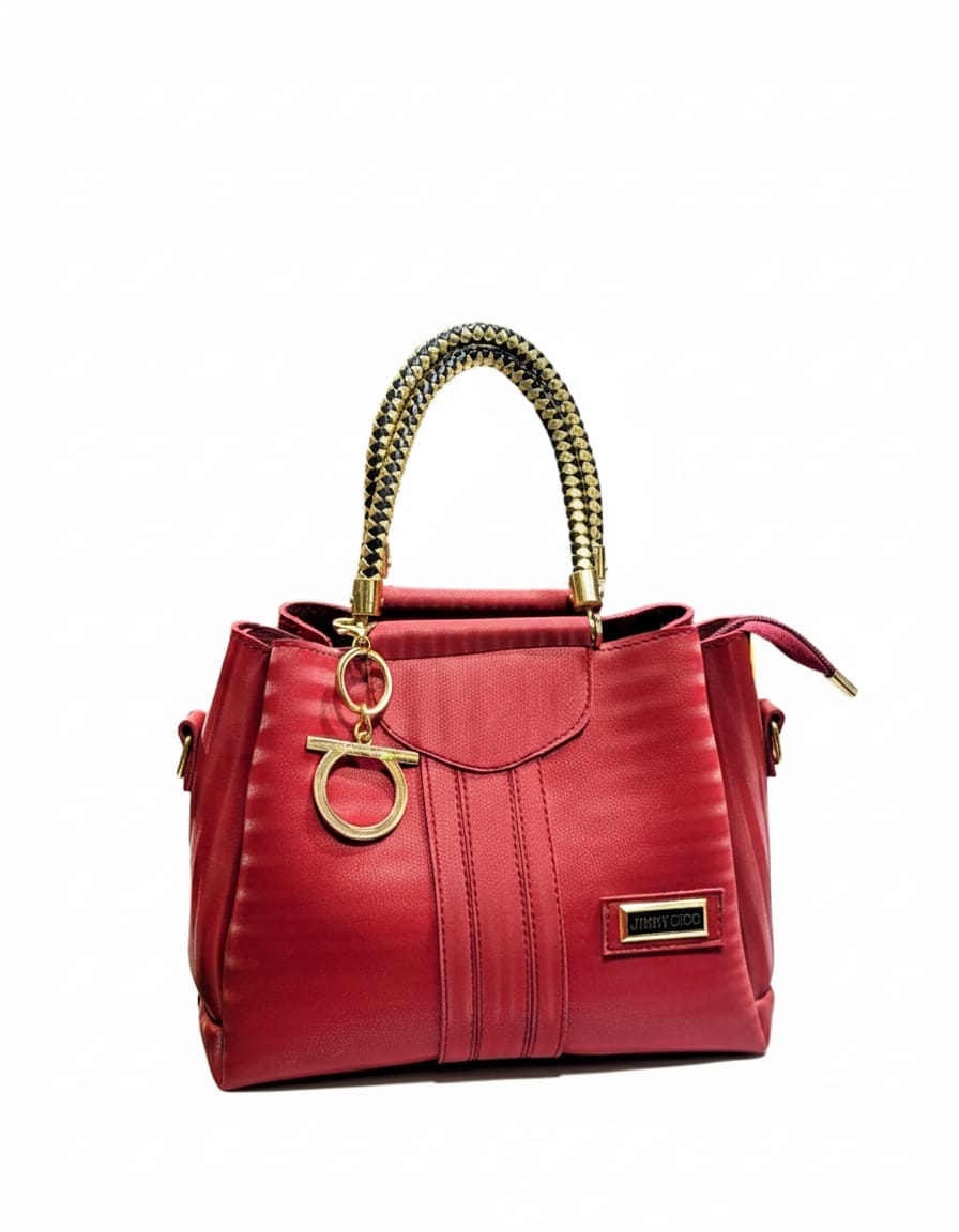This striking red handbag is the definition of sophisticated chic. Crafted from rich, textured vegan leather, its structured silhouette makes a bold, professional statement, perfect for the office or an upscale evening out. The standout feature is the unique braided gold and black top handle, which offers a luxurious, designer-style touch and ensures you carry confidence with every step.