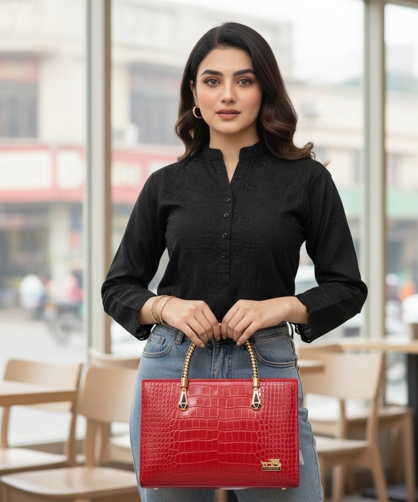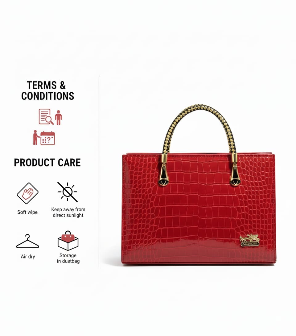 Make a bold statement with the Scarlet Alligator-Embossed Structure Bag. This stunning piece is crafted from premium faux leather featuring a luxurious alligator texture in a vibrant, show-stopping red hue. It’s the perfect accessory for those who dare to stand out.