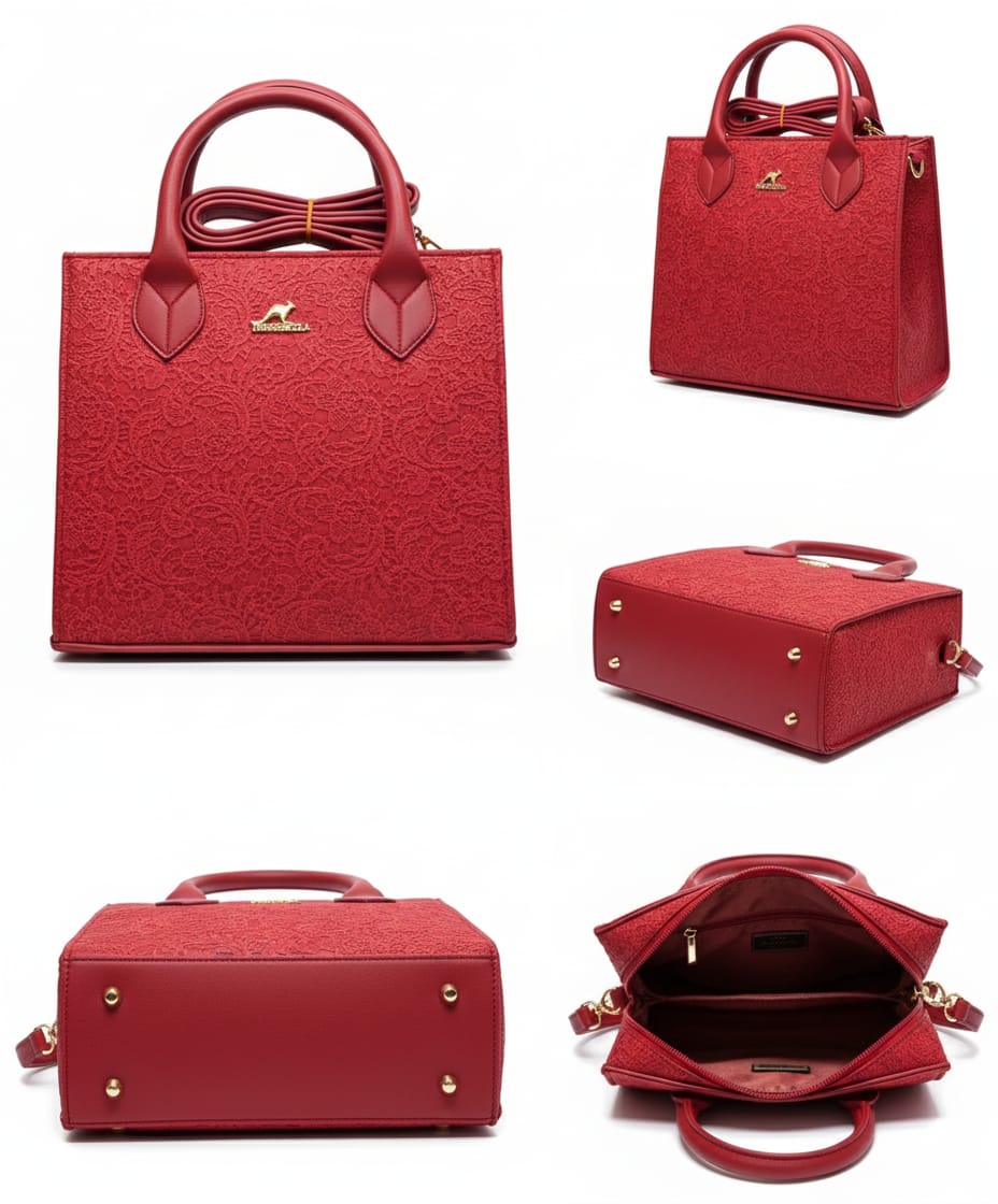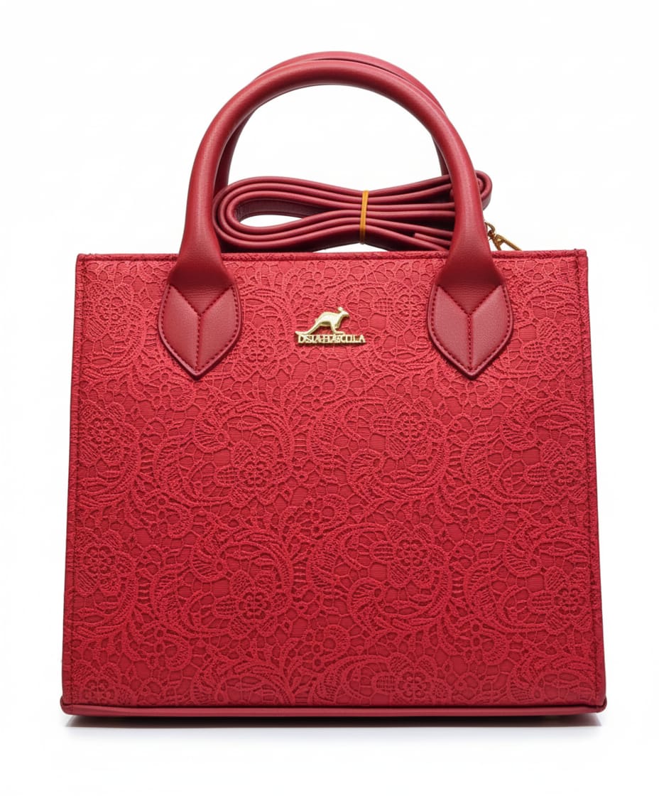 Title: Elegant Red Lace Structured Handbag with Crossbody Strap