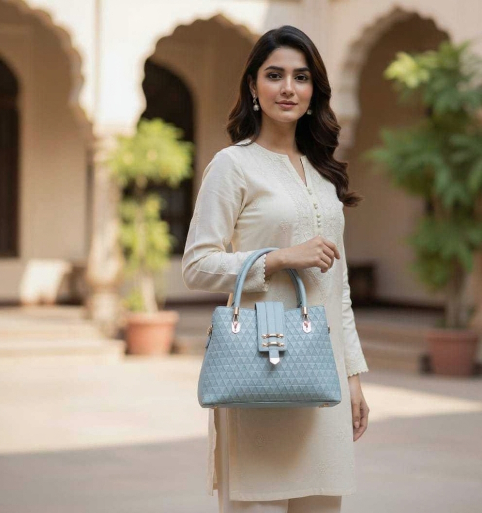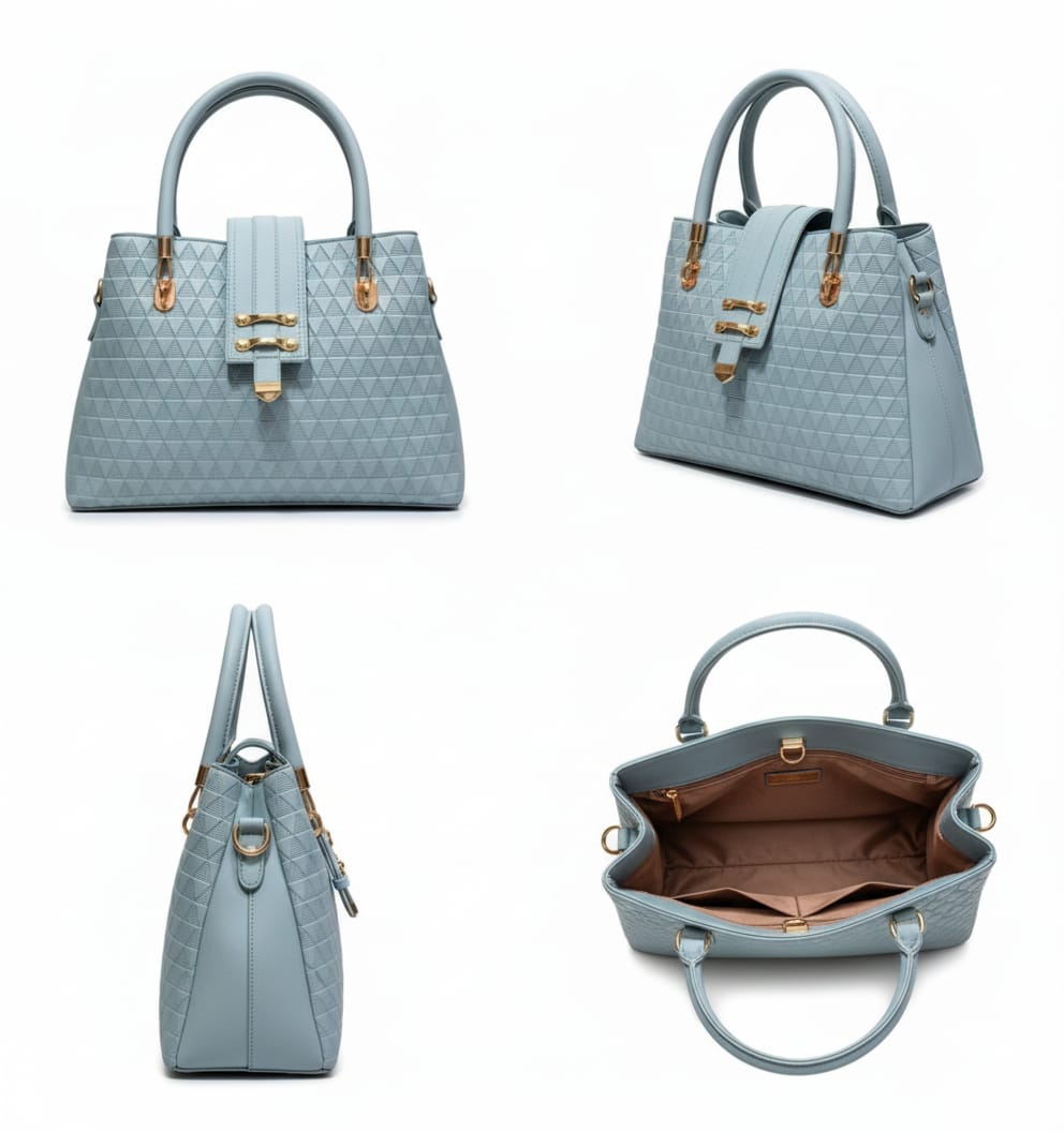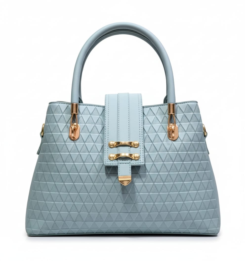 Title: Chic Sky Blue Structured Handbag with Quilted Detail and Gold Hardware