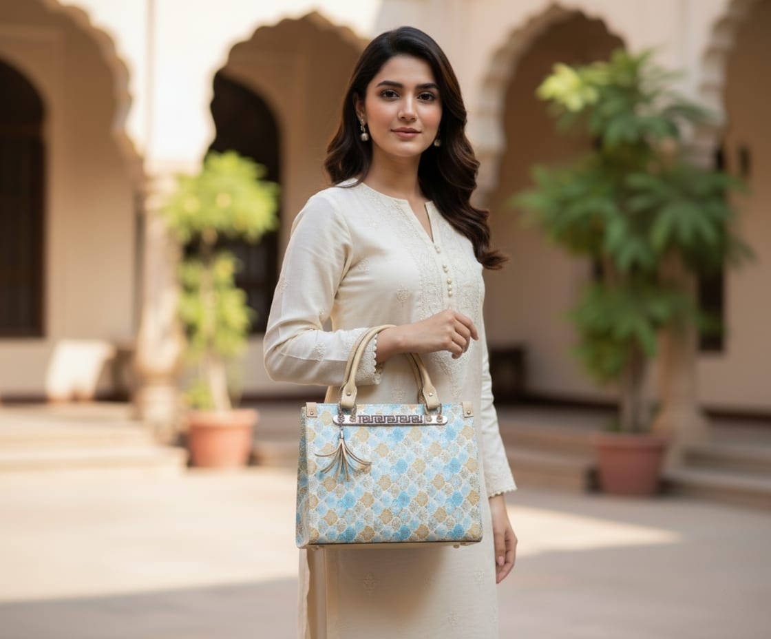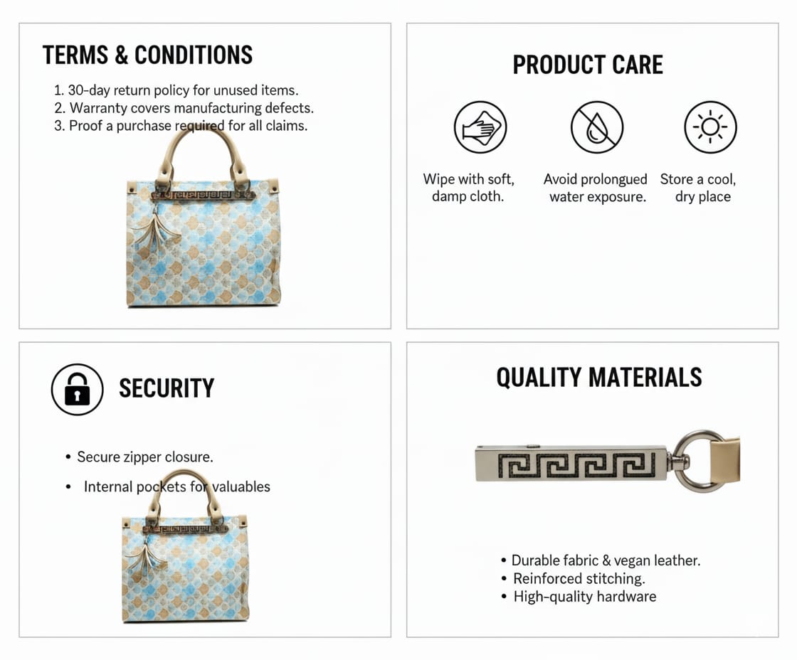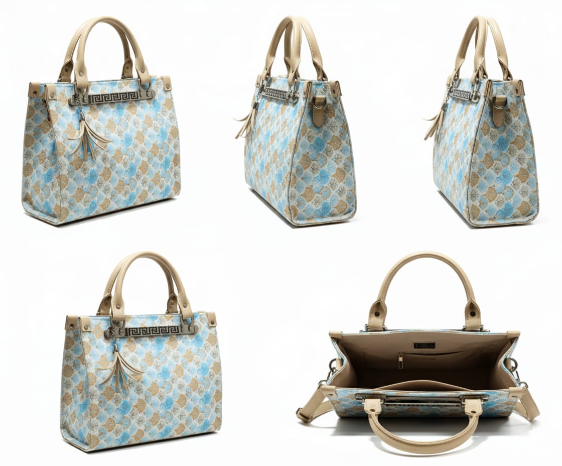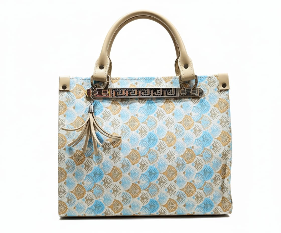 Premium Detailing: Features elegant silver-toned hardware, including a distinctive decorative silver plate with a Greek key/Meander-style pattern, and a stylish tassel charm.