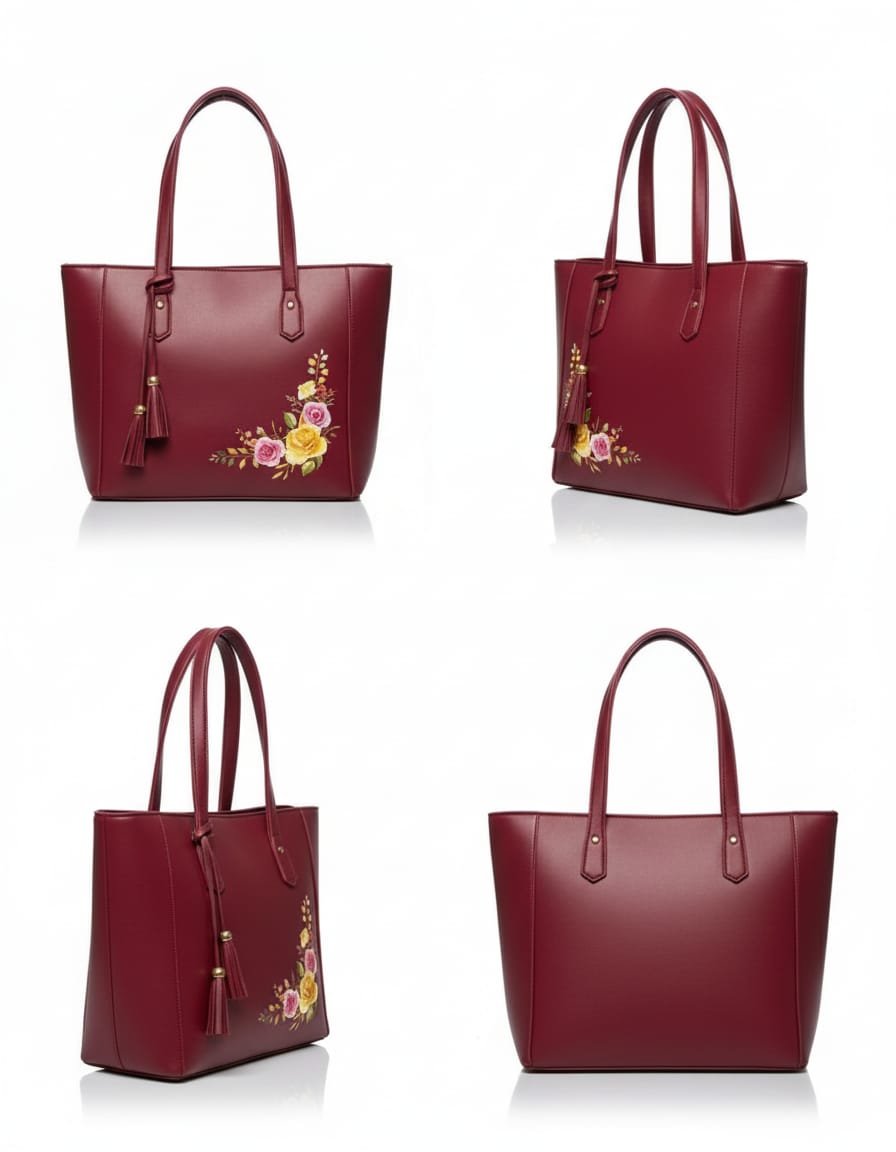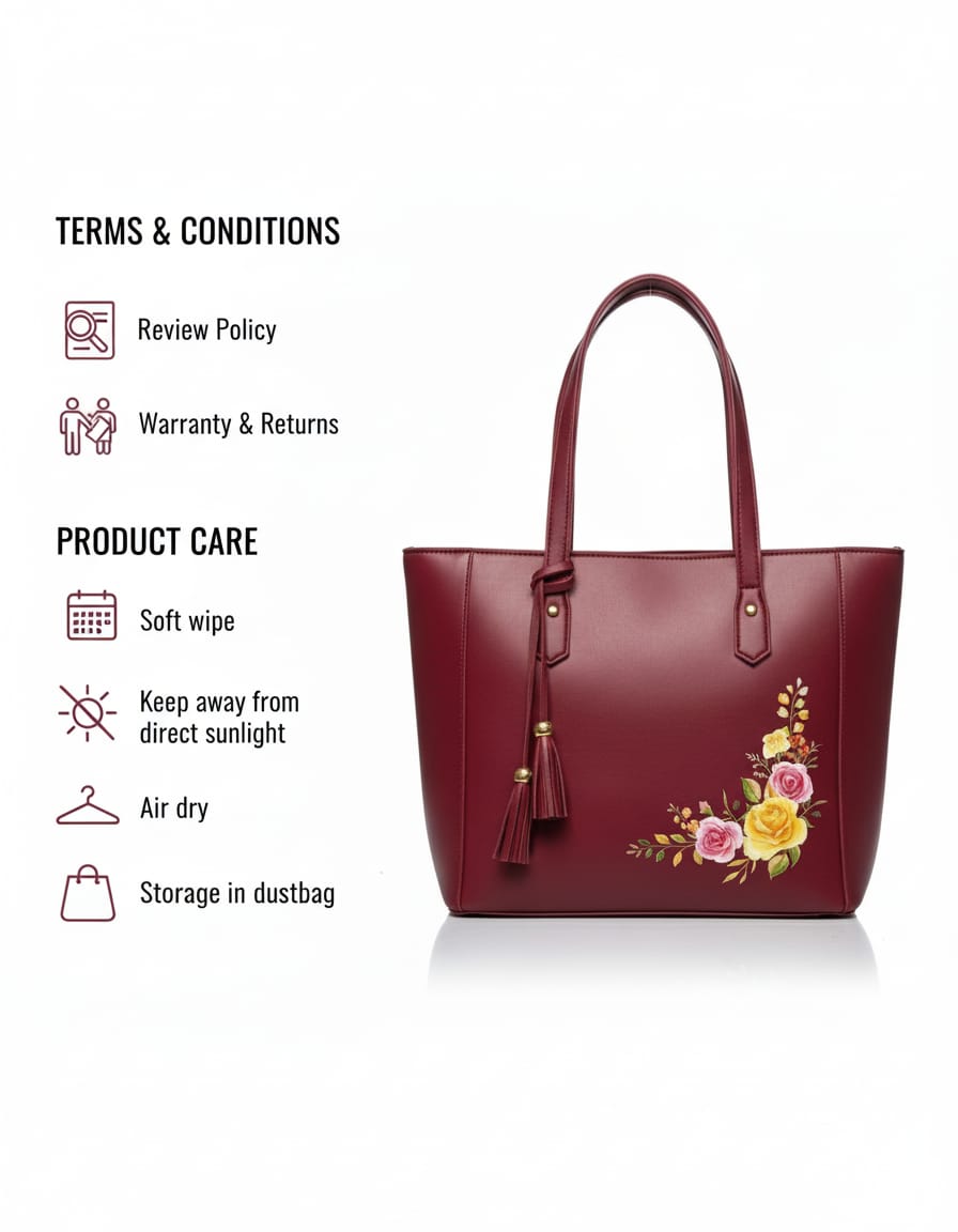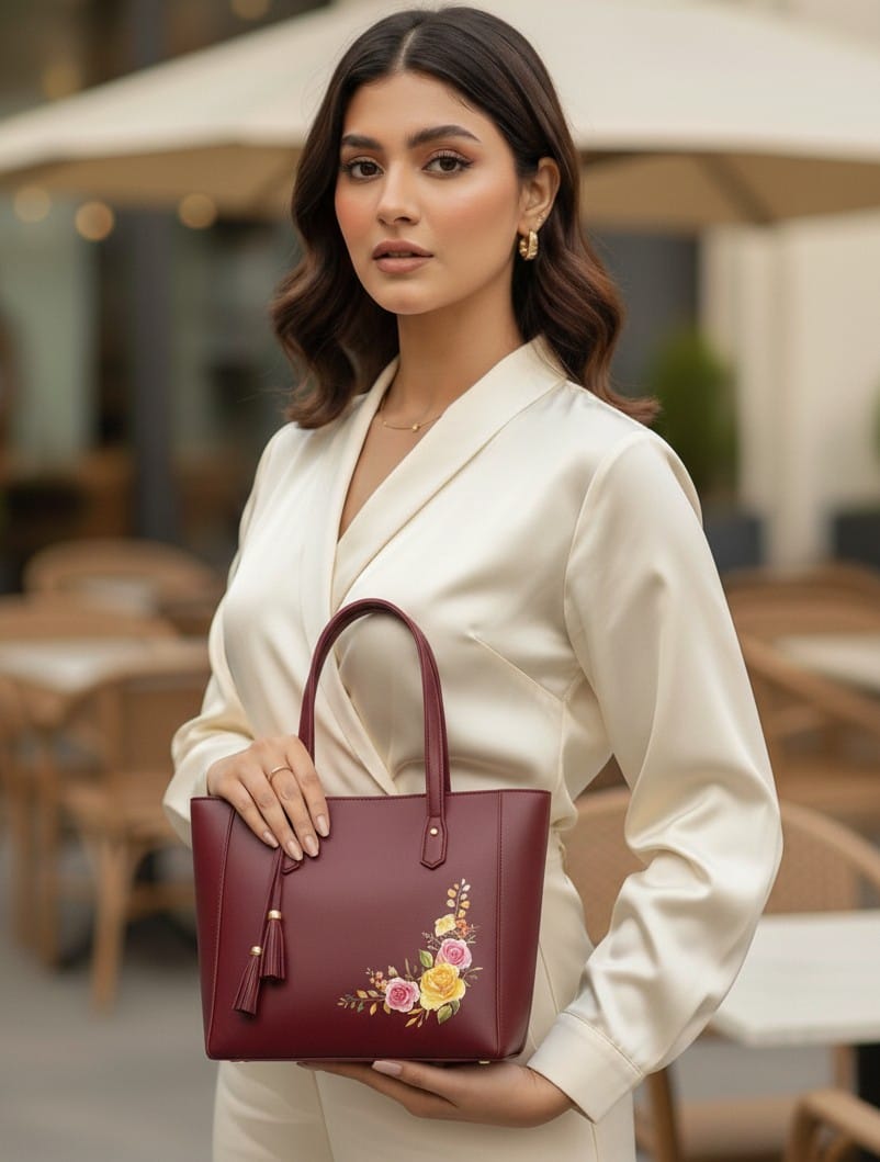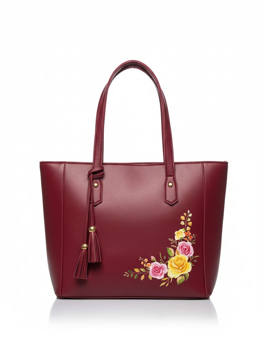 Carry a touch of springtime elegance with the Bloomsbury Floral-Embellished Tote. This exquisite handbag is crafted from smooth, high-quality faux leather in a rich, captivating Burgundy or Deep Wine hue. Its classic structure is elevated by a vibrant, hand-painted style floral design featuring delicate pink and sunny yellow roses on the front corner.